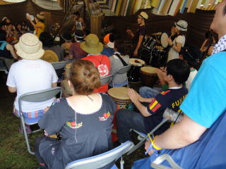 ストーンサークルに戻ると、なんか楽器の貸し出しが始まってる。